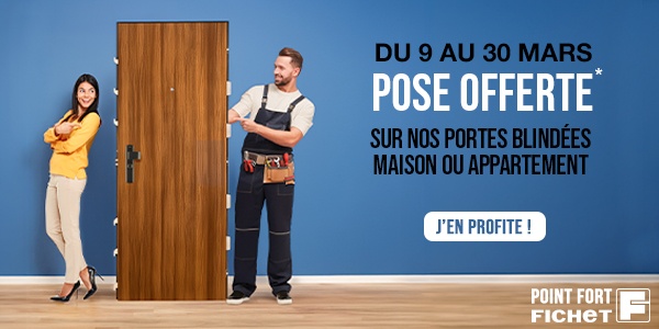 Du 9 mars au 31 mars 2026, Point Fort Fichet propose une offre spéciale sur les portes blindées pour maison ou appartement : la pose est offerte *.